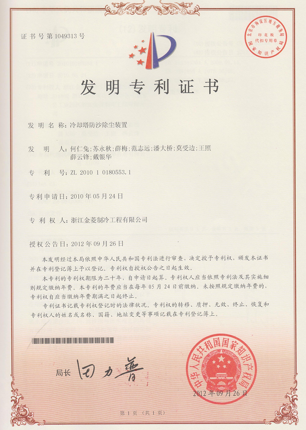 Patent certificate of Dust-proof and sand-removing device for cooling tower